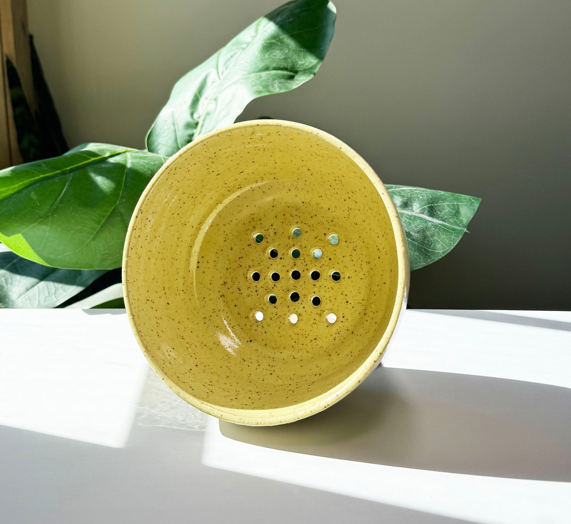 This is a handmade Berry Bowl! White or Mint glaze on top of speckled buff clay. Drainage holes are arranged in the center. Food safe. Ok to use on the top shelf of dishwasher, but hand wash is recommended. Each piece is one of a kind. There may be some natural imperfections and we embrace that! .