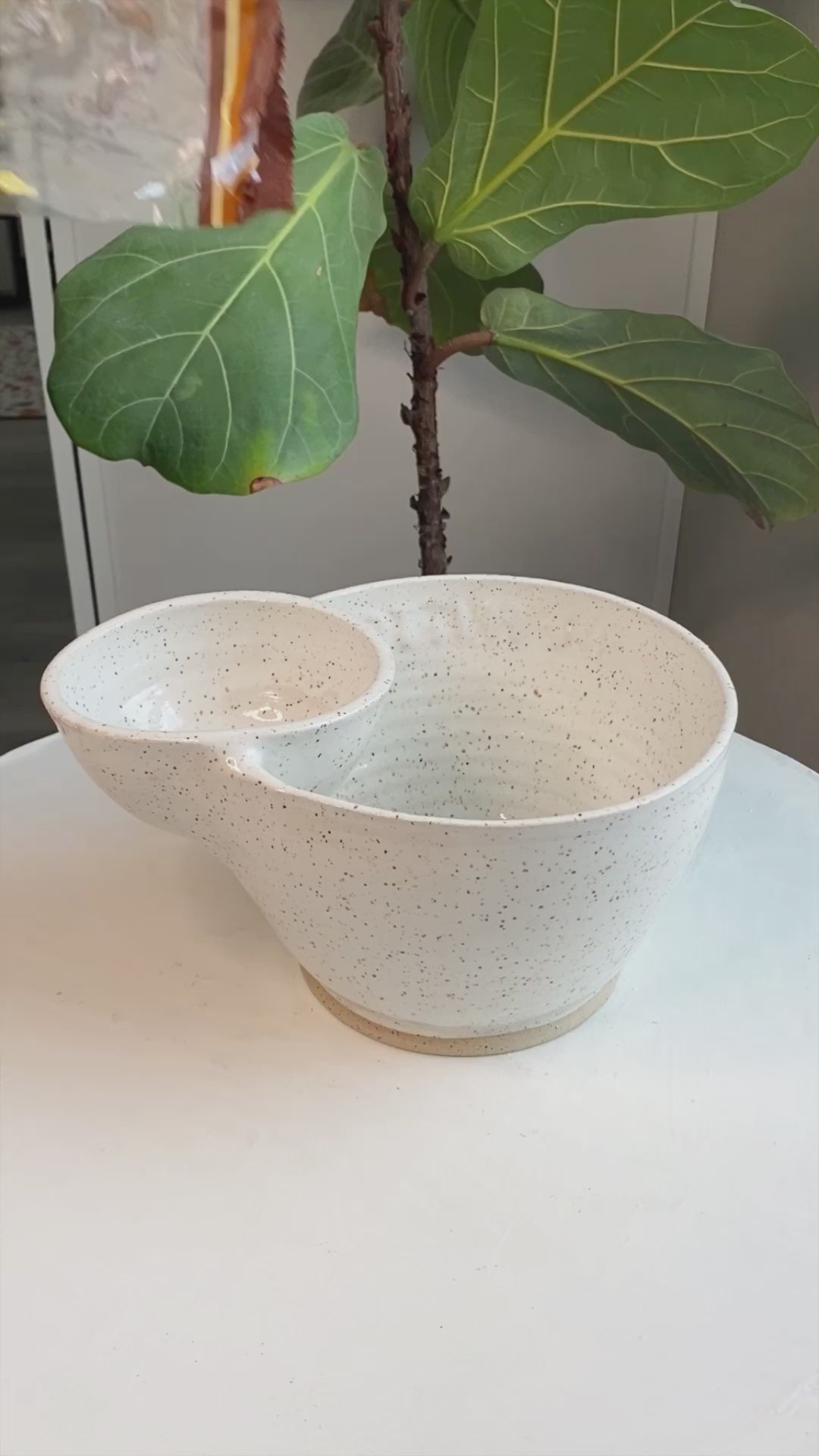 This is a handmade Chip and Dip bowl. It can be customized with letters/numbers. I use speckled buff clay. Food safe. Ok to use on the top shelf of dishwasher, but hand wash is recommended. Each piece is one of a kind. There may be some natural imperfections and we embrace that!