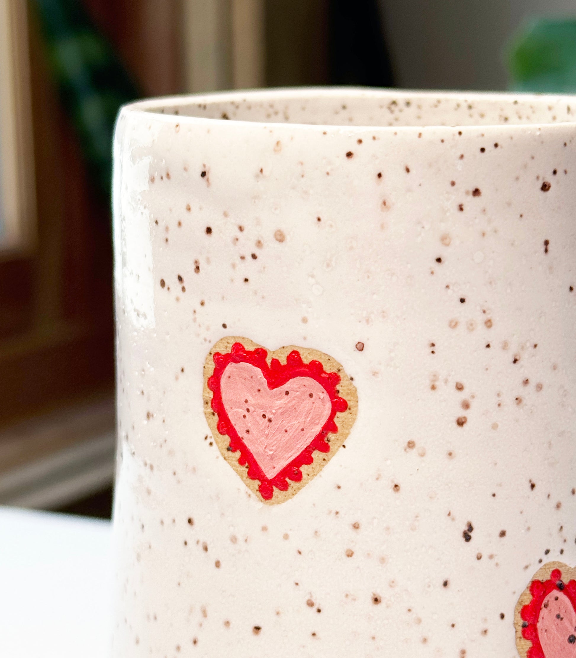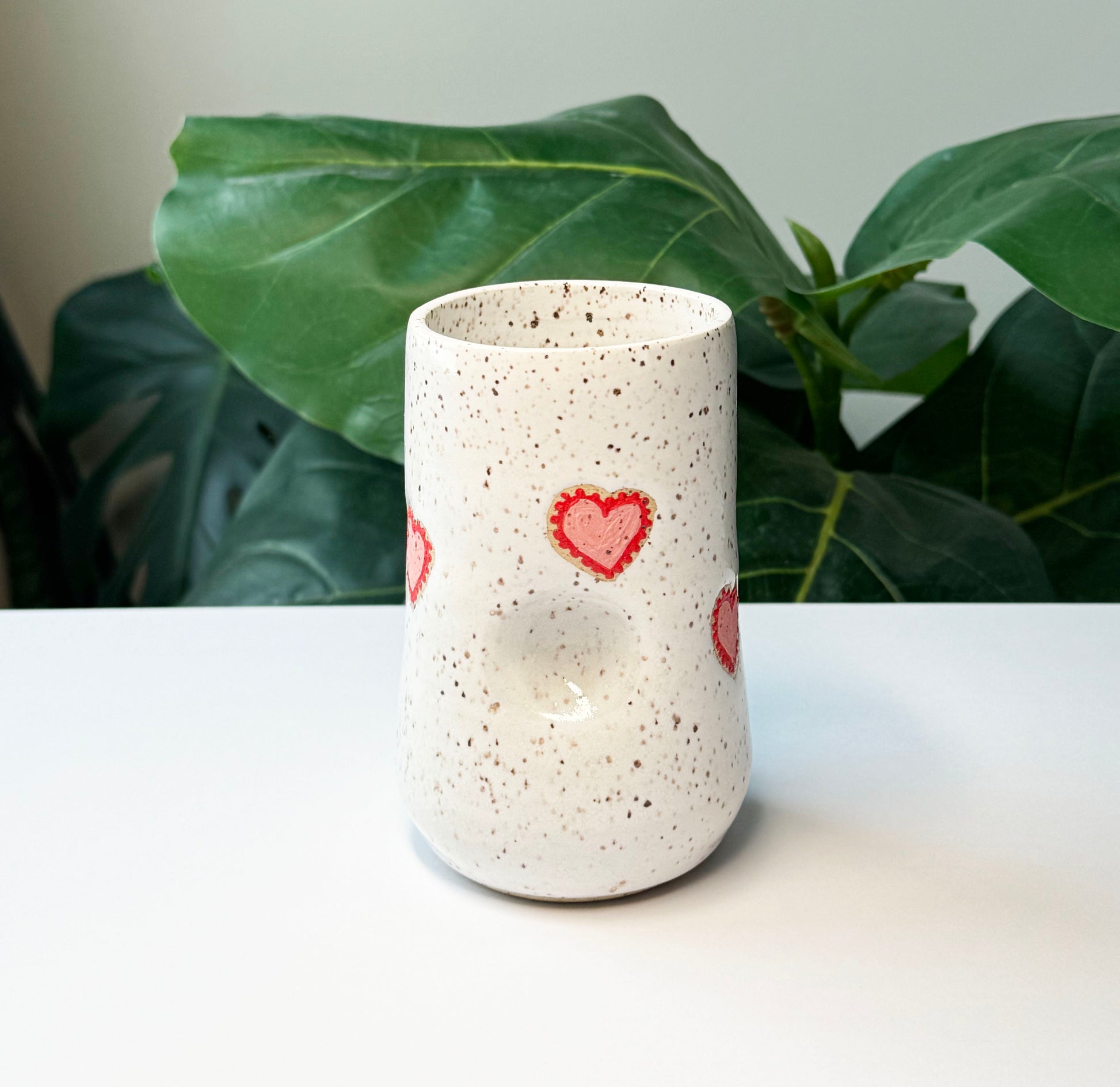 This is a handmade Thumb Cup! Hearts surrounded by a classic white glaze, on top of speckled buff clay. Complete with a comfy place to rest your thumb. Food safe. Ok to use on the top shelf of dishwasher, but hand wash is recommended. Each piece is one of a kind. There may be some natural imperfections and we embrace that!