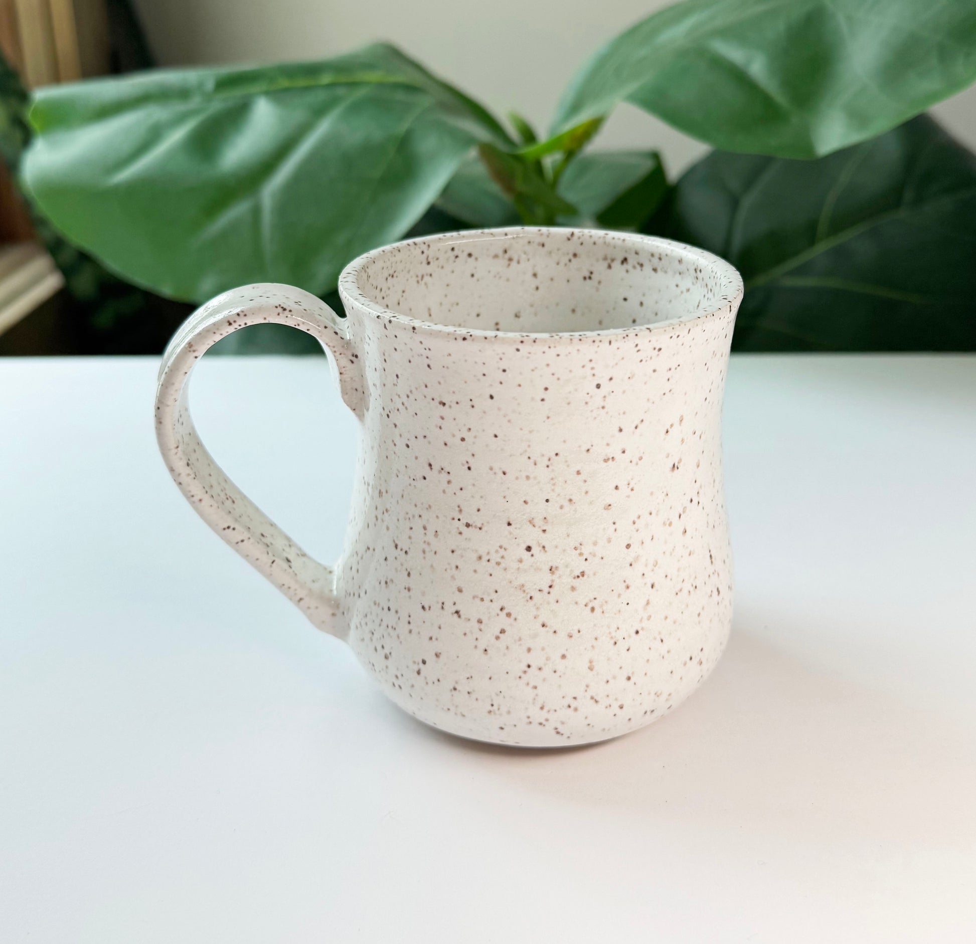 This is a handmade Mug! Charcoal & Dark Green glazes on top of speckled buff clay. Food safe. Ok to use on the top shelf of dishwasher, but hand wash is recommended. Each piece is one of a kind. There may be some natural imperfections and we embrace that!
