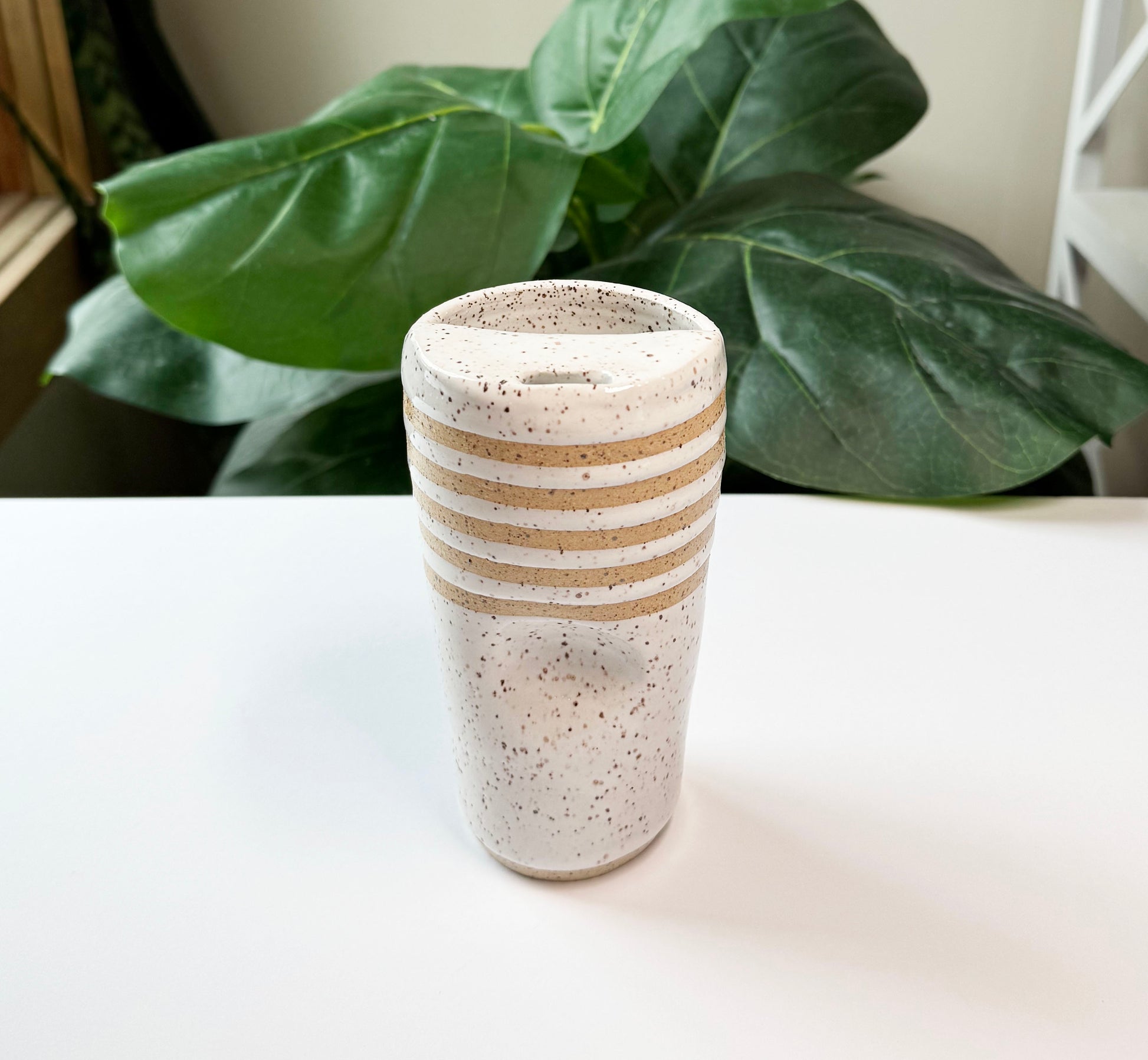 This is a handmade To-go Thumb Cup! White glaze on top of speckled buff clay. Complete with a comfy place to rest your thumb. Food safe. Ok to use on the top shelf of dishwasher, but hand wash is recommended. Each piece is one of a kind. There may be some natural imperfections and we embrace that!